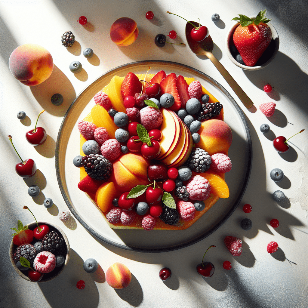 - Assemble the Tart: Layer the sliced peaches and berries in the cooled tart shell. Pour the cream mixture evenly over the fruits.
